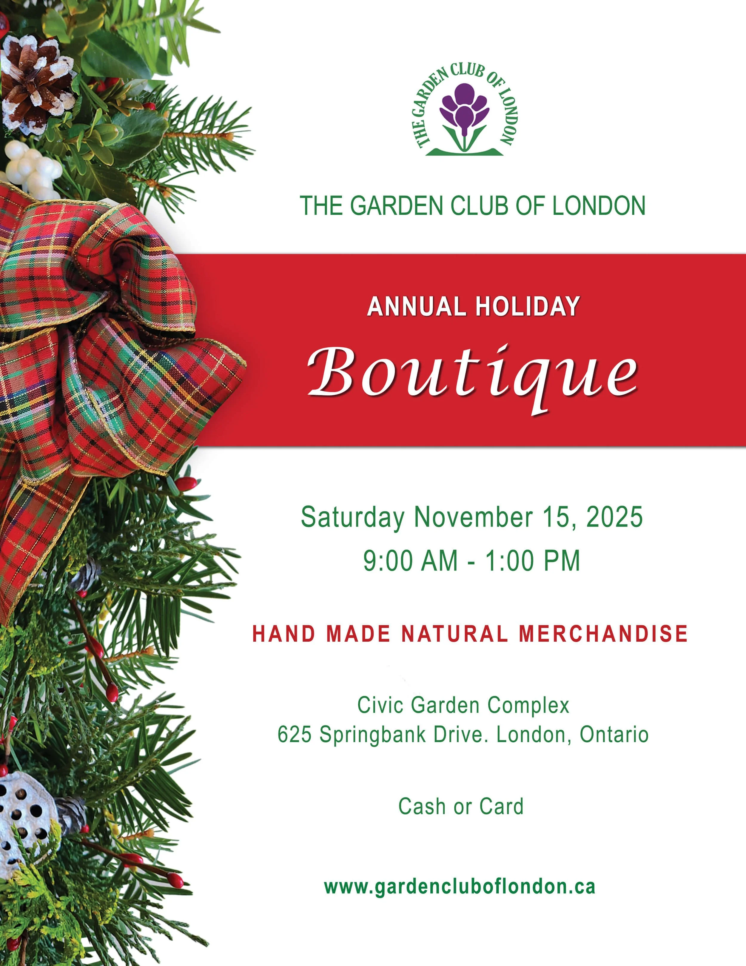 The Garden Club of London's Annual Christmas Boutique fundraiser. Unusual and interesting handmade items using natural materials. Tearoom, urn inserts, tree decor, herbs and preserves, handmade soaps, pressed flower cards, wreaths, lavender products and lots more. Cash or Card.