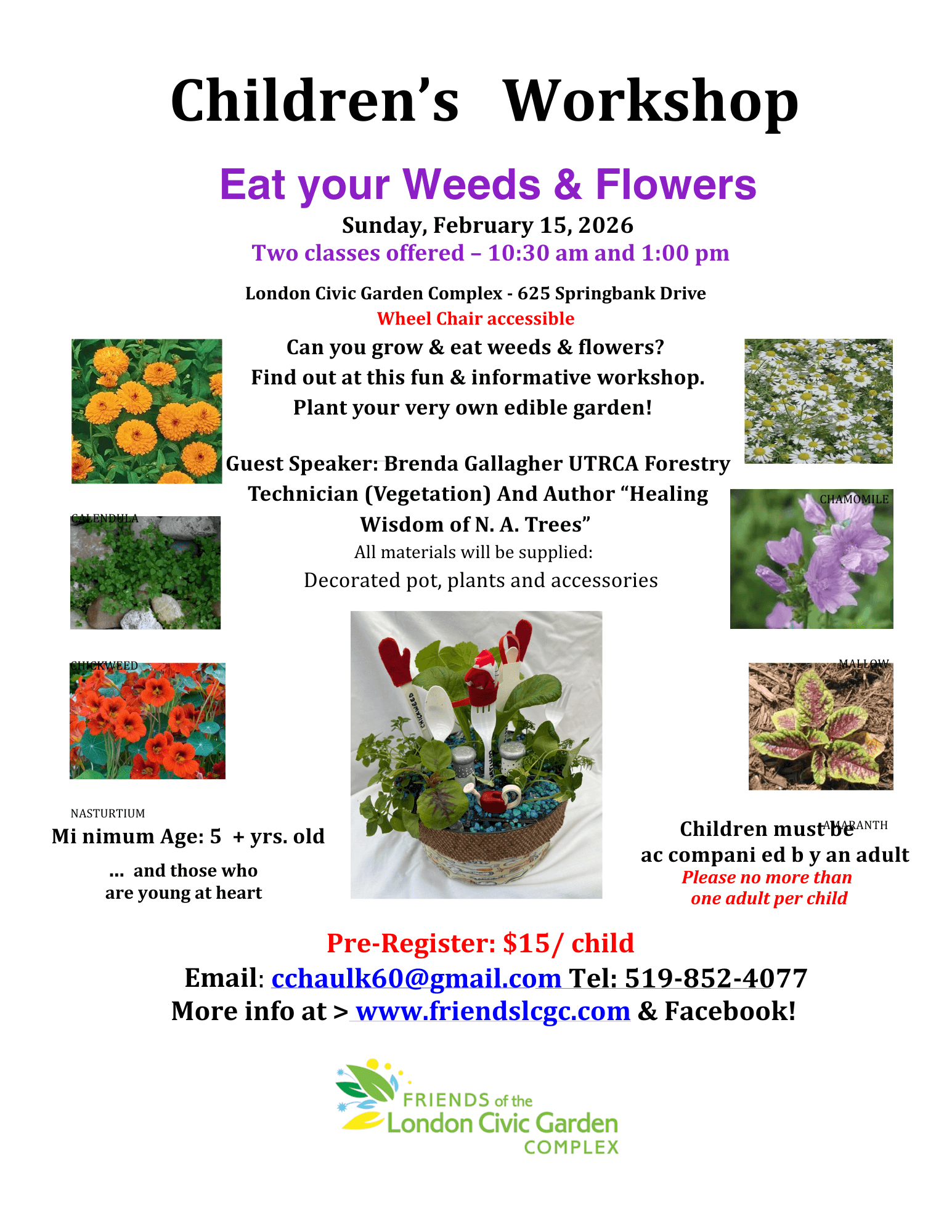 FLCGC Children's Workshop Sunday, February 15, 2026 10:30 a.m. 3:30 p.m. London Civic Garden Complex 625 Springbank Drive London, ON, N6K 4T1 Canada (map) Google Calendar ICS